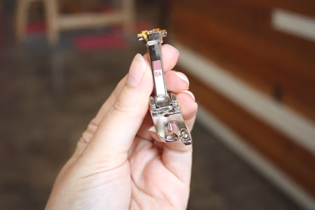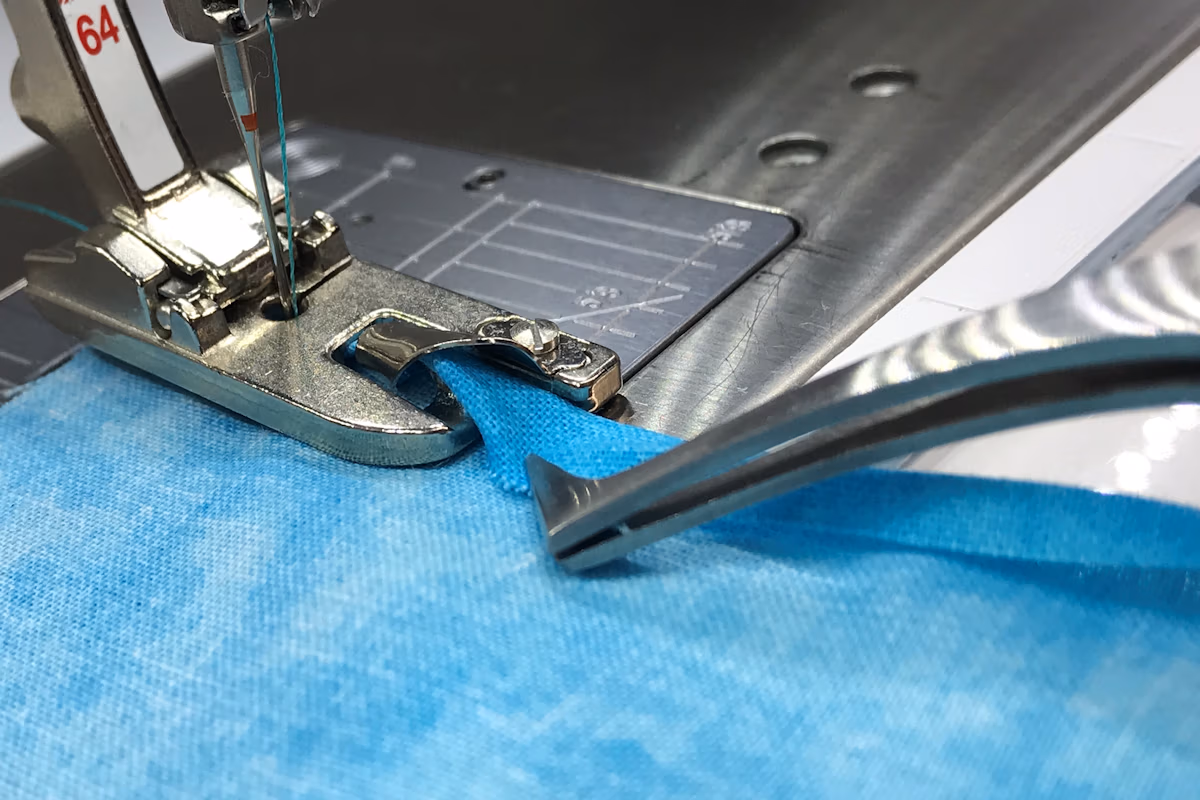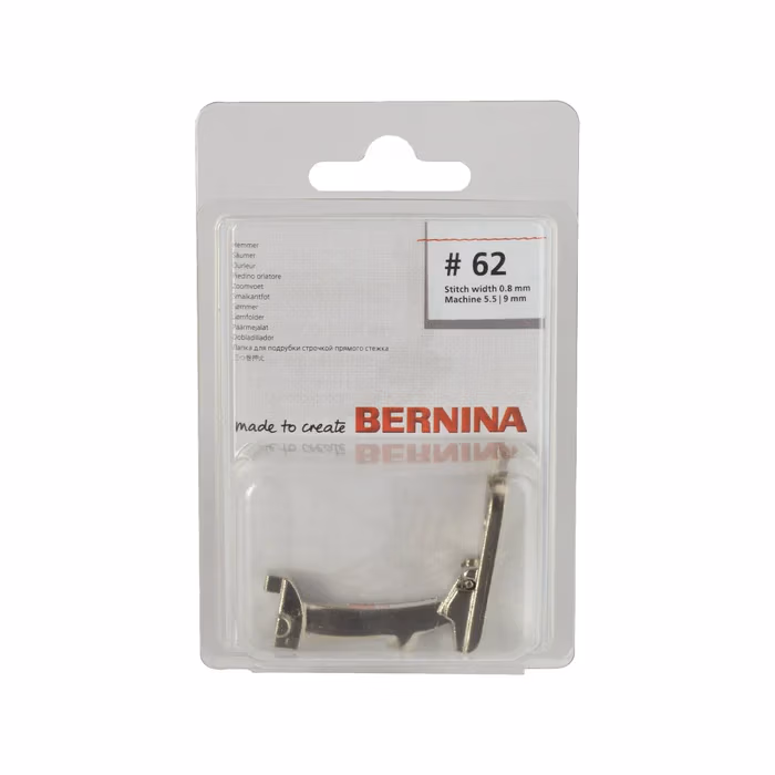 The presser foot’s sole includes a guide that securely holds the fabric edge in place up to the needle hole, keeping it from slipping out of the scroll. The scroll at the front of the foot effortlessly folds the fabric under twice in one smooth step, creating a strong, fray-resistant hem. BERNINA offers seven hemmer presser feet to suit different hem widths. Straight Stitch Hemmer #62, for instance, has a channel width matching the finished 2mm hem, perfect for precise, narrow hems on lightweight fabrics.