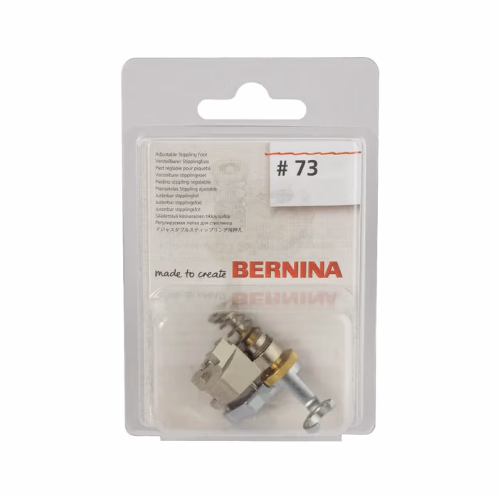 The Adjustable Stippling Foot #73 is designed to make free-motion quilting easier, especially for intricate designs and detail work. Its wide-open shape provides a clear view of the needle insertion point, ensuring accuracy in every stitch. You can adjust the height up to 1/6” to accommodate the thickness of your quilt sandwich, giving you consistent stitch quality. The matte grey coating reduces glare, enhancing visibility and allowing you to focus on achieving perfect quilting results with ease.