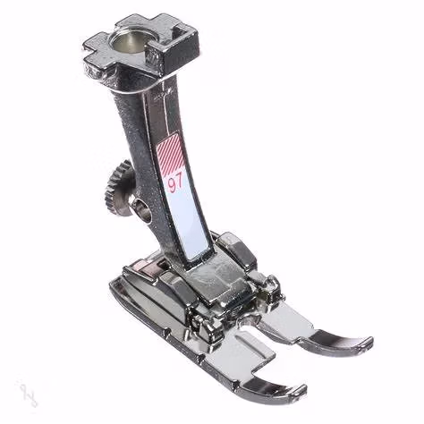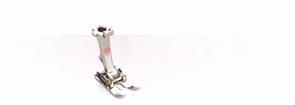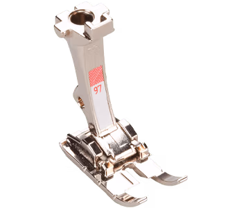 BERNINA Patchwork Foot #97 is crafted for precise straight-stitching, making it ideal for sewing ¼” or ⅛” seam allowances and top stitching. Compatible with BERNINA machines that offer a maximum stitch width of 9mm, this foot is specially designed to work seamlessly with the machine’s feeding system, ensuring superior accuracy when piecing patchwork blocks. Its sole’s footprint aligns perfectly with the feed, supporting smooth and precise stitching for impeccable patchwork results on 9mm BERNINA machines.