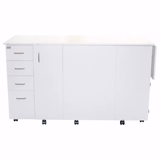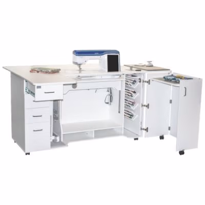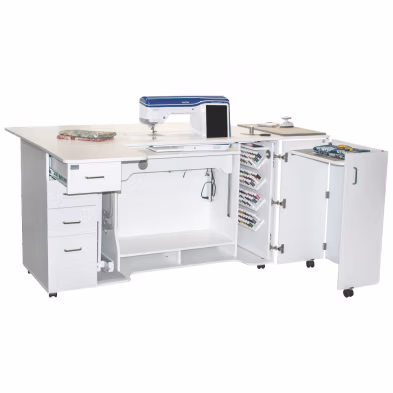 The White Sewing Cabinet Model 8479 with an Electric Lift is designed for an ergonomic sewing experience, particularly suited for taller individuals. Standing at 36-1/2 inches, this cabinet offers an ideal sewing height for comfort and ease. The built-in electric lift allows for effortless machine adjustments, bringing the sewing surface to the perfect level with a touch of a button. With added features like a swing-up side platform, a second machine or serger station (45 lbs limit), and an adjustable foot control platform, this cabinet provides spacious, flexible workspace options for cutting, pressing, and machine operations, ensuring a seamless sewing experience.