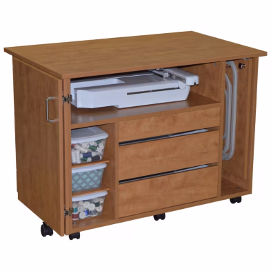 The Model 90 Embroidery Storage Chest is the ultimate organization solution for embroidery enthusiasts. Designed with practicality in mind, this chest features a spacious 27-inch-deep shelf specifically tailored to accommodate your embroidery unit securely. It also includes dedicated storage for thread spools, ensuring your colors are neatly arranged and easily accessible. Three generously sized drawers provide ample space to store hoops and other essential notions, keeping everything you need for your embroidery projects in one convenient location. Whether you’re a seasoned embroiderer or a hobbyist, the Model 90 is the perfect addition to keep your workspace tidy and efficient.